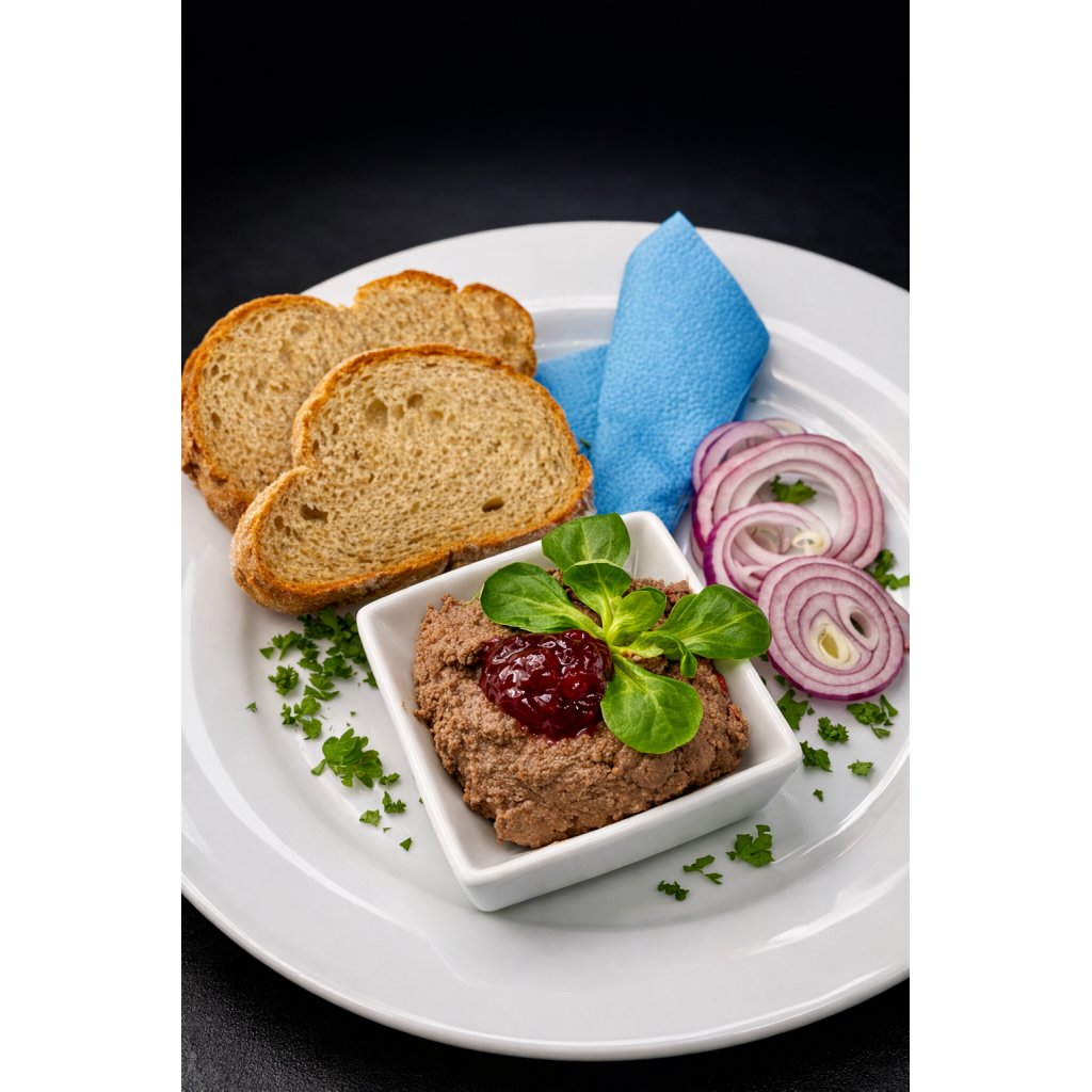Paštika Domácí paštika játrová , rozpečený chléb, brusinky