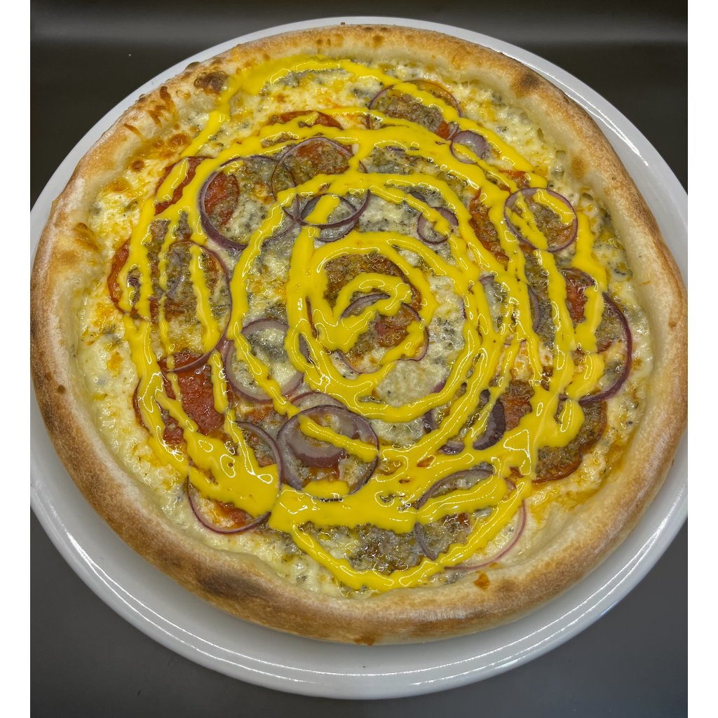 Smetanový základ, mozzarella, gouda, chorizo, salám, niva, cibule, cheddarová omáčka