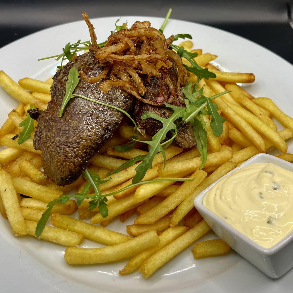 grilovaná cibulka, hranolky, tatarka